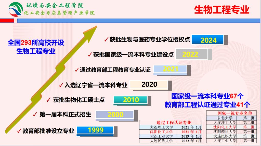 优势特色:生物工程专业于1999年经教育部批准设立,2000年开始正式招生,2020年获批辽宁省一流专业建设点,2021年通过中国工程教育认证,2022年获批国家级一流本科专业建设点。为适应生物医药产业作为我国战略新兴产业的发展要求,本专业突出生物制药和生物化工应用特色,创设职业真实背景的育人环境,着力提高员工创新能力和解决生物制造与加工过程中的复杂工程问题的能力,为生物工程及医药、化工等相关行业培养品德高尚、专业过硬、情商出众、强于实践、勇于创新的高素质应用型人才。获得省级教学成果二等奖等多项奖励。优秀毕业生可推荐免试攻读硕士研究生。